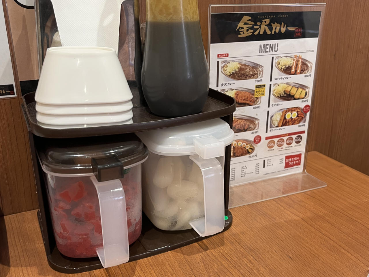 らっきょうと福神漬けが置いてあります。カレーが届くまでも、つい食べてしまいます。