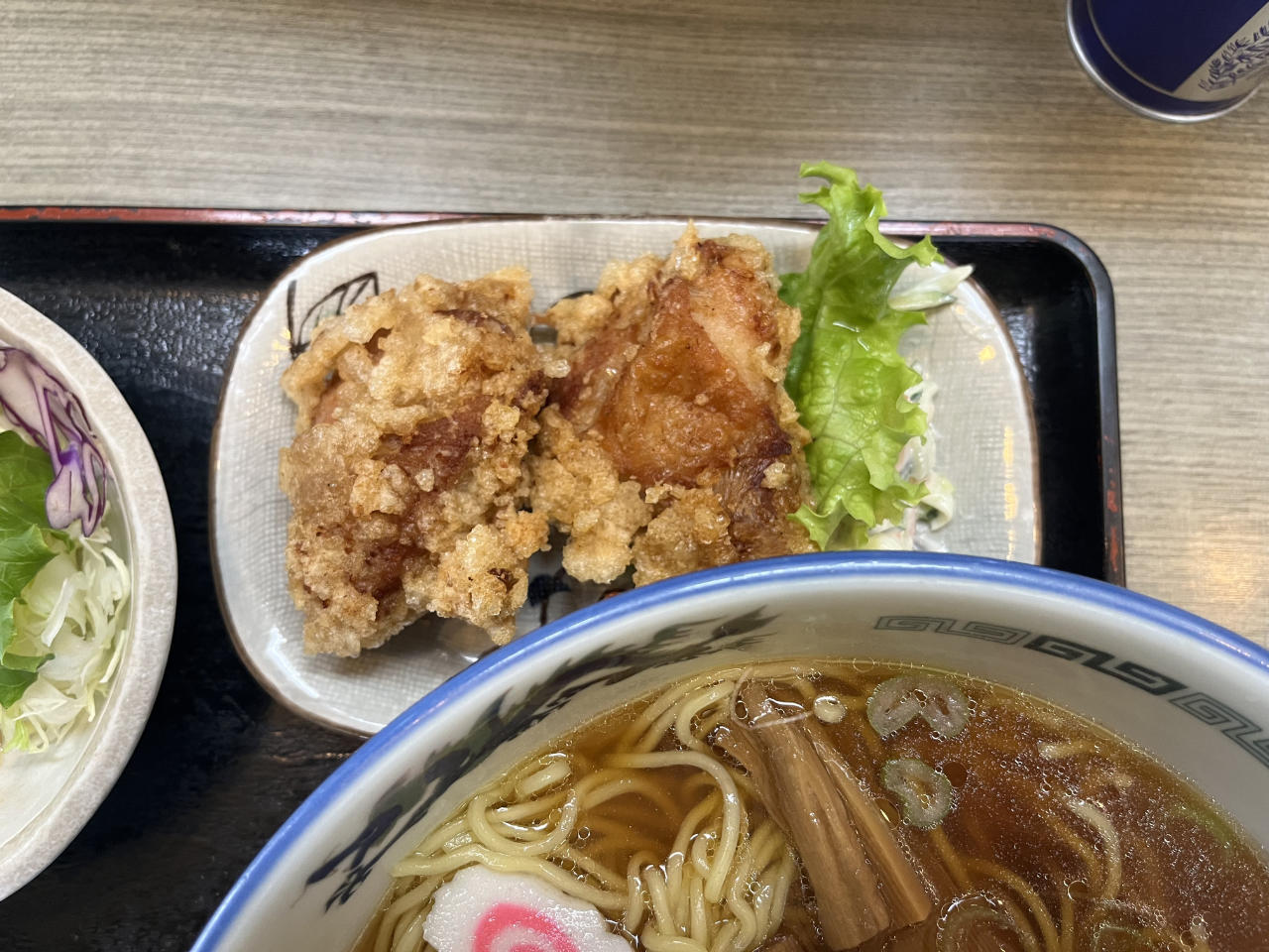 ラーメン、鶏唐揚げ、白米、サラダ、漬物。大満足です。