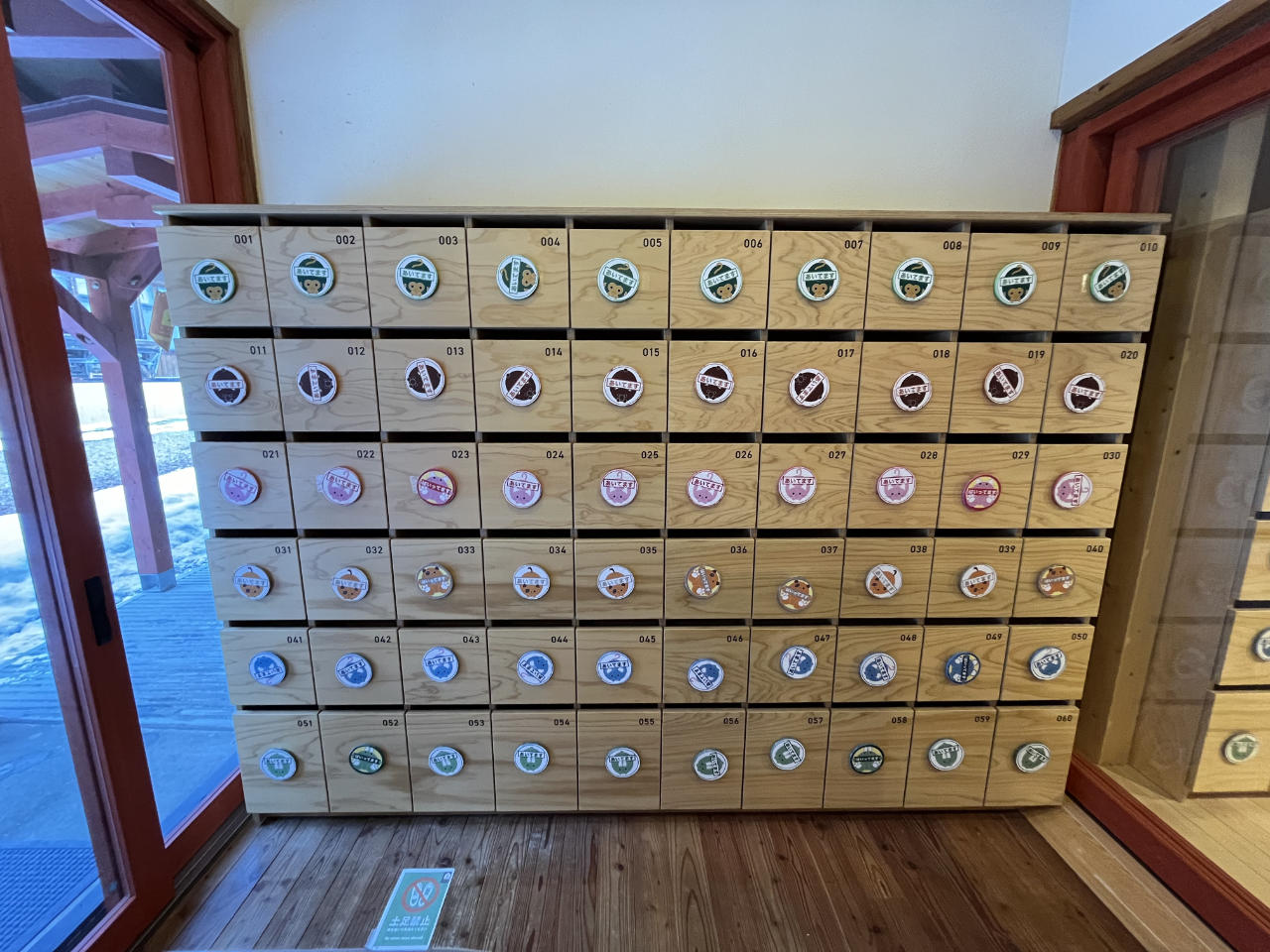 下駄箱です。手前の丸いやつは、靴が入っているか識別するためのものです。