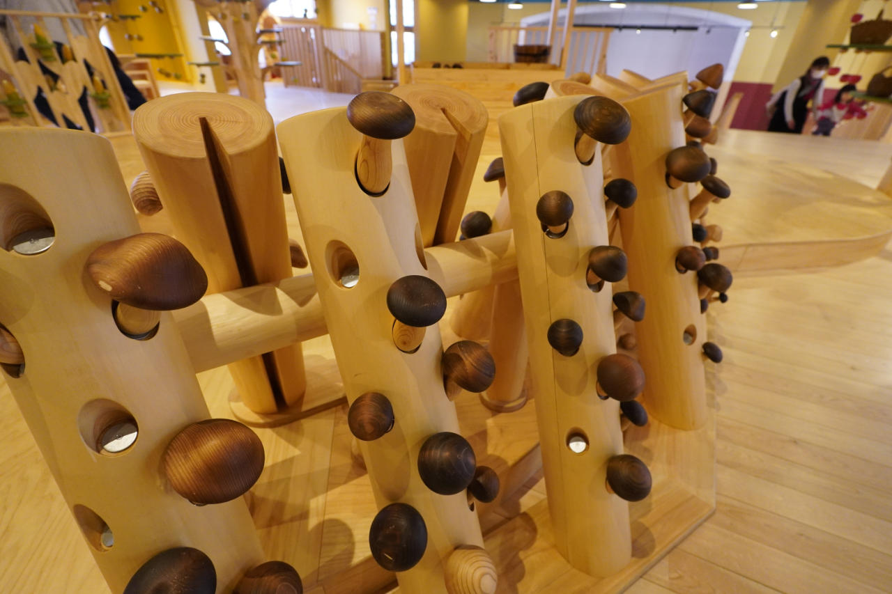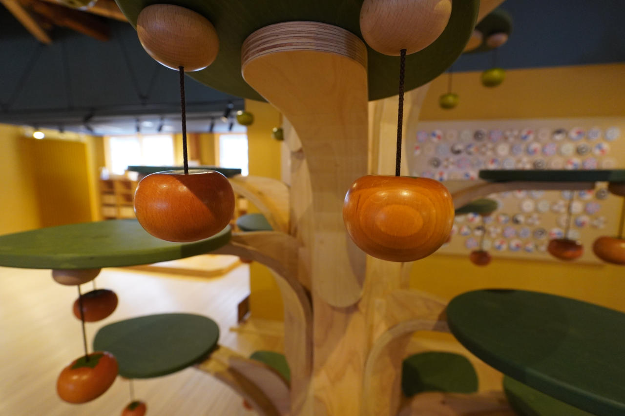おもちゃ美術館では、内装や家具に、木曽ヒノキをはじめとした「木曽五木」がふんだんに使われています。