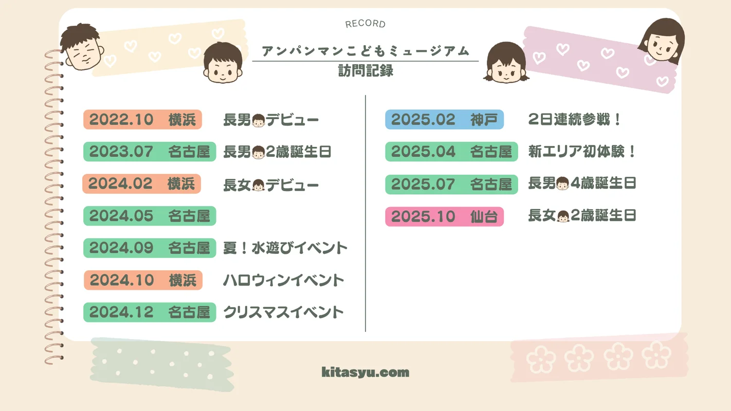 下のイラストは、過去に訪れたアンパンマンミュージアムの記録です。