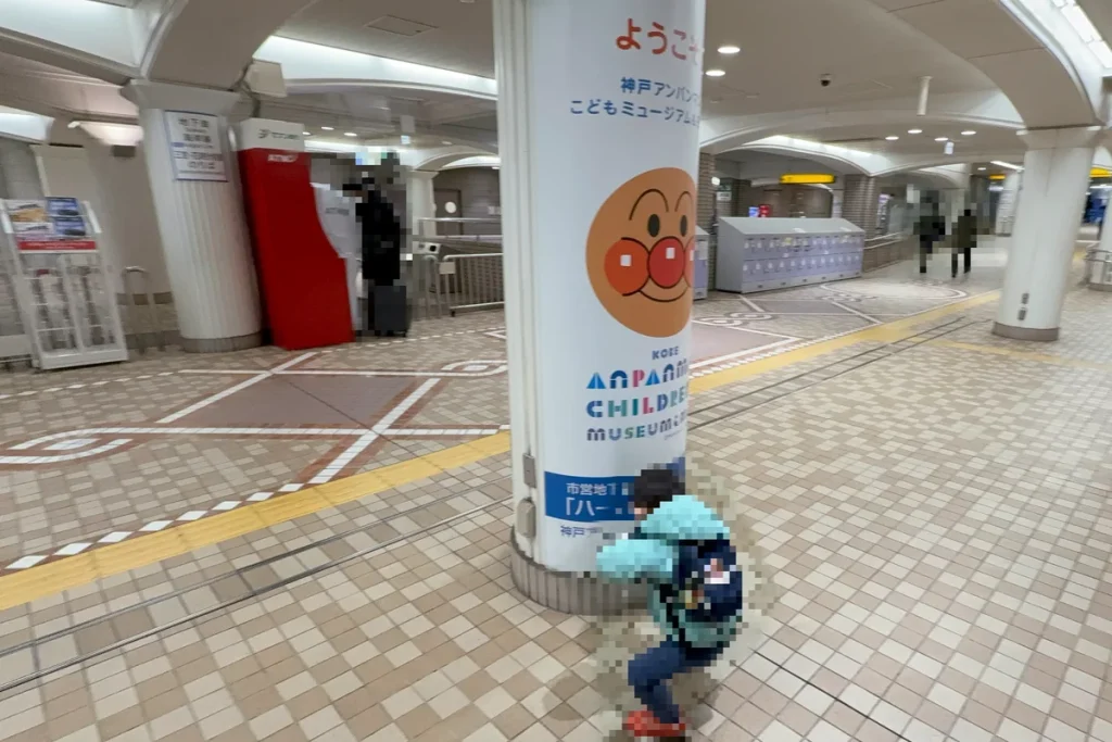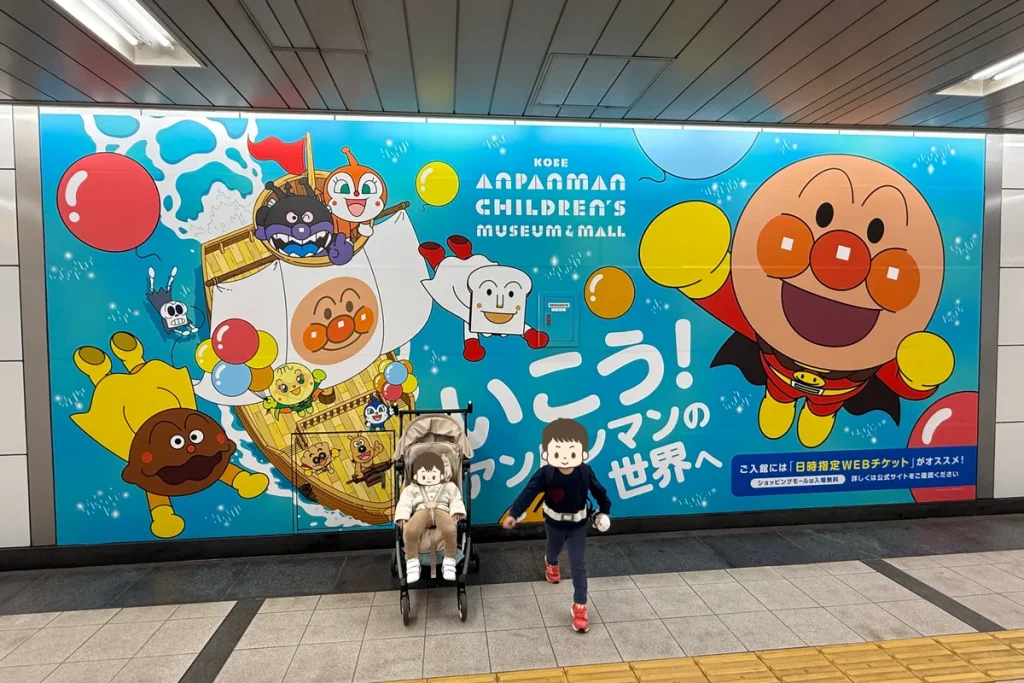 電車を下りると待ち構えていたのは、なんと神戸アンパンマンミュージアムのポスターが貼られた柱が!子どもは大喜びです。